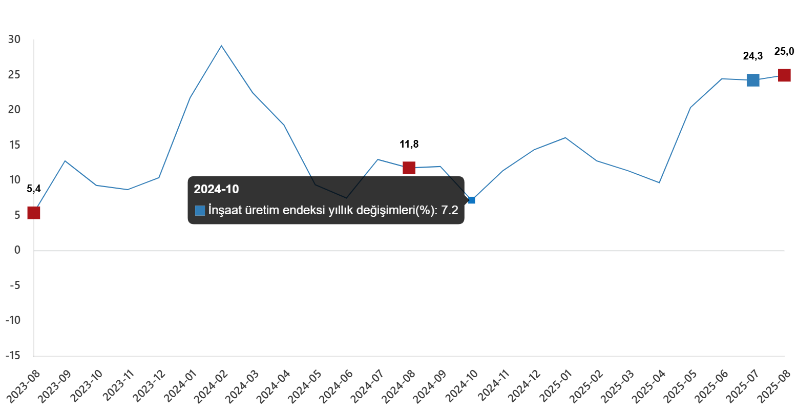 İnşaatın alt sektörleri (2021=100 referans yıllı) incelendiğinde, 2025 yılı Ağustos ayında bina inşaatı sektörü endeksi bir önceki yılın aynı ayına göre %26,6 arttı, bina dışı yapıların inşaatı sektörü endeksi %17,4 arttı ve özel inşaat faaliyetleri sektörü endeksi %25,1 arttı.